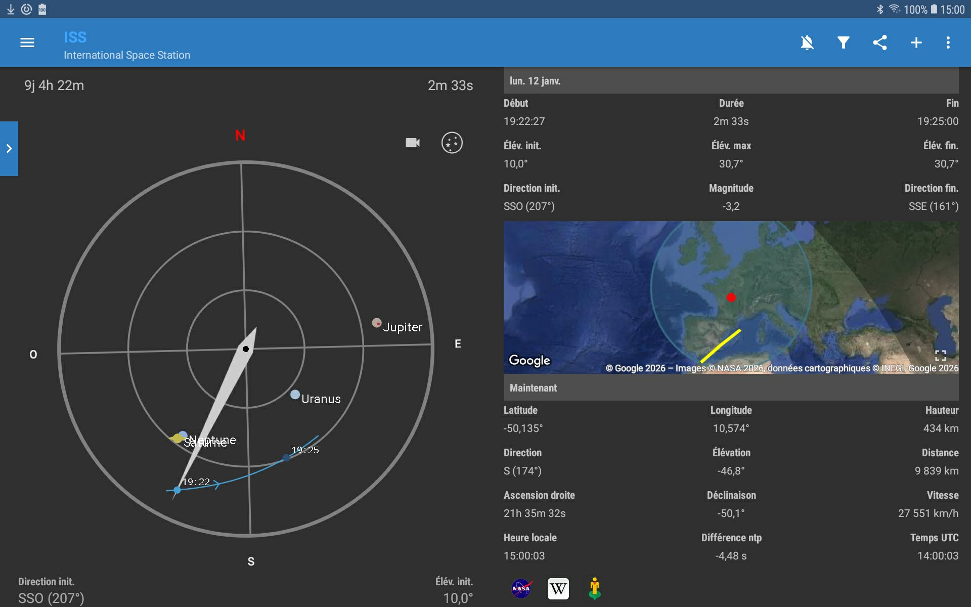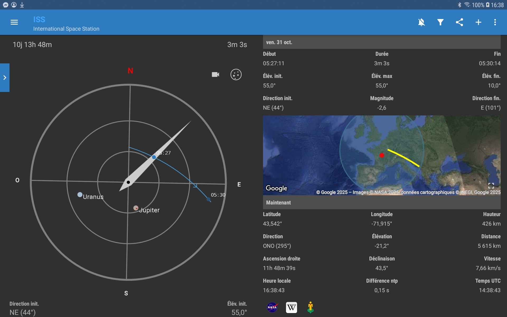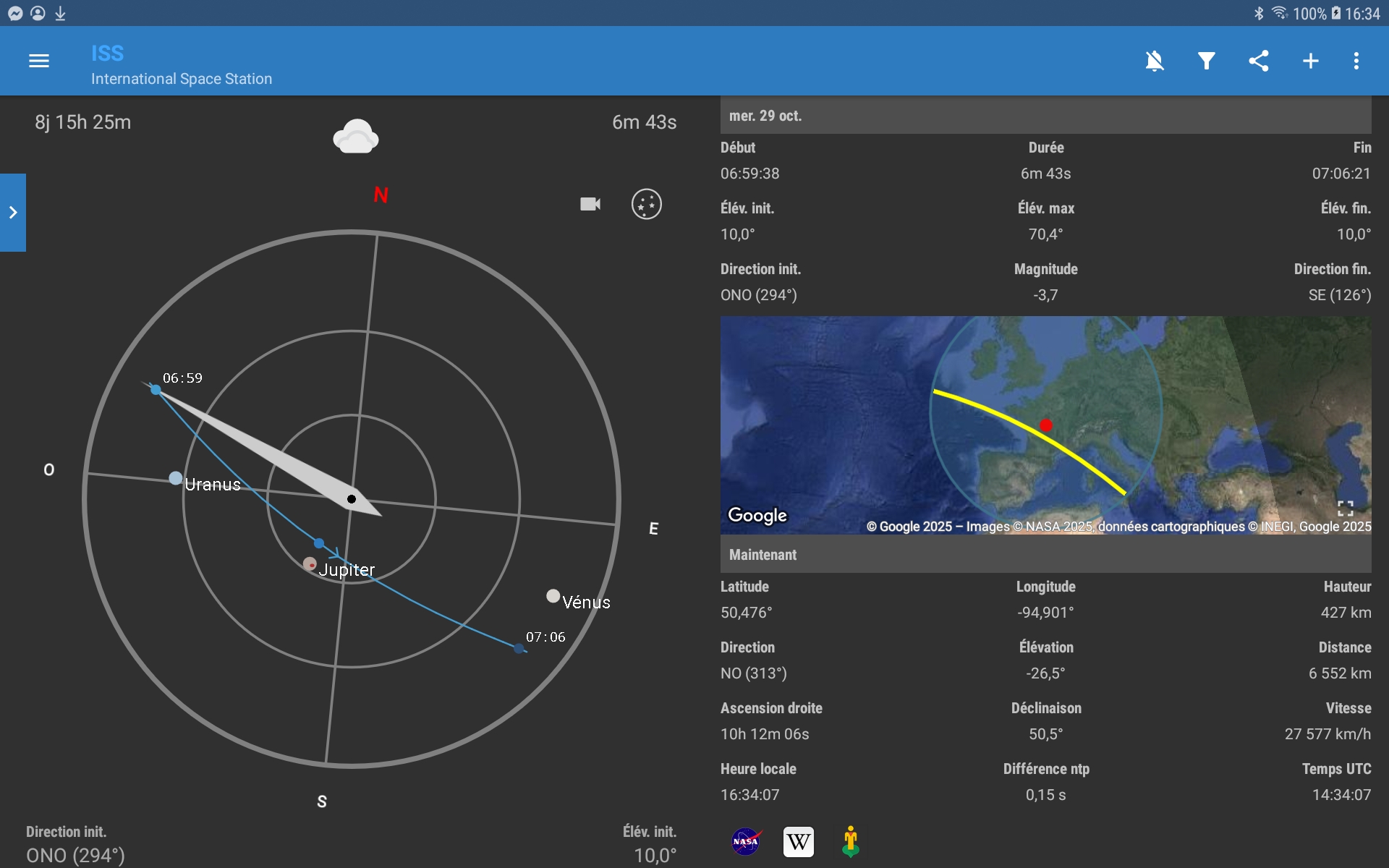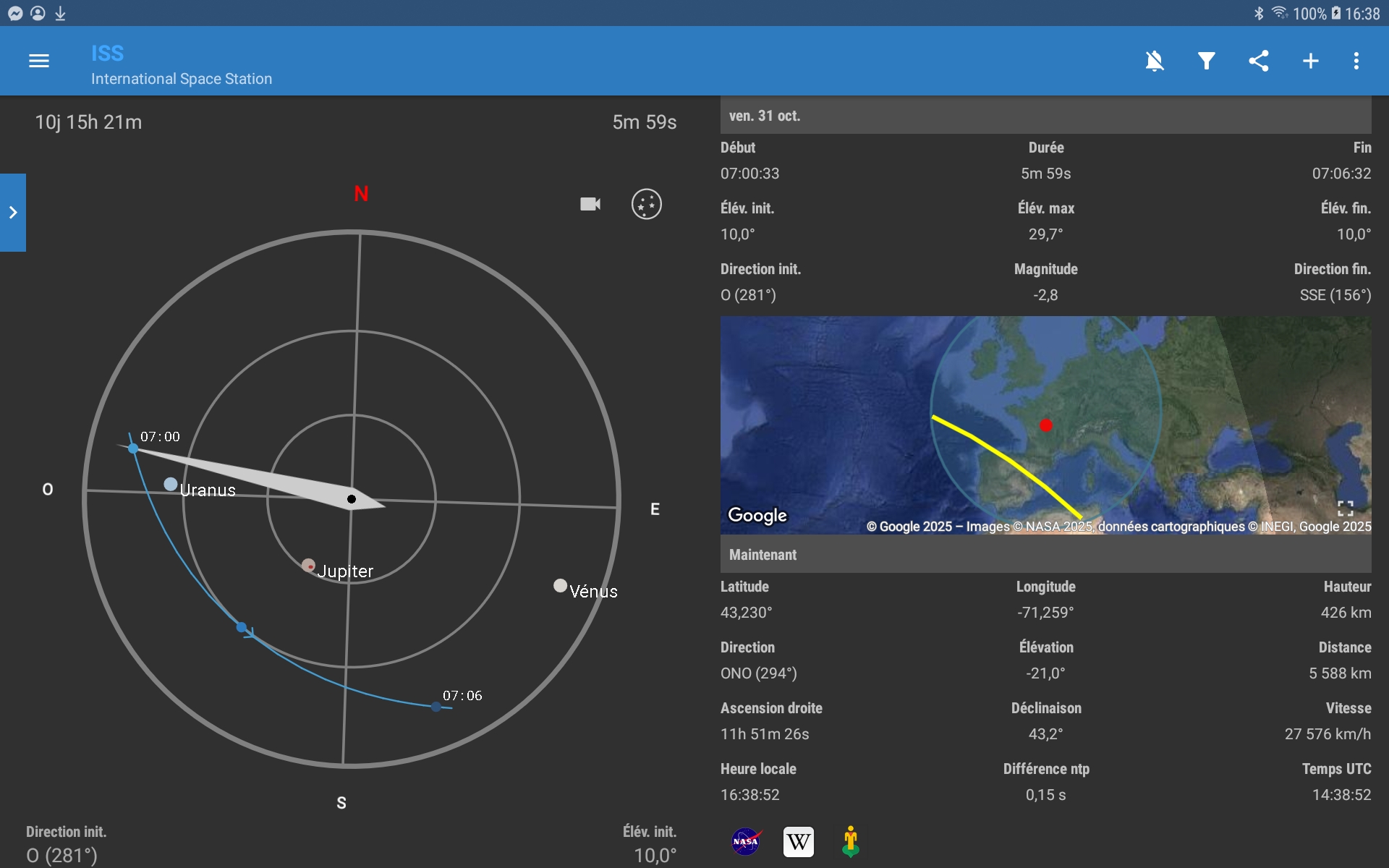 | ↓ Ces images sur https://www.heavens-above.com/ ↓ | ↓ Captures d'écran/ ISS détector pour Androïd. Prev/10 jours↓ |