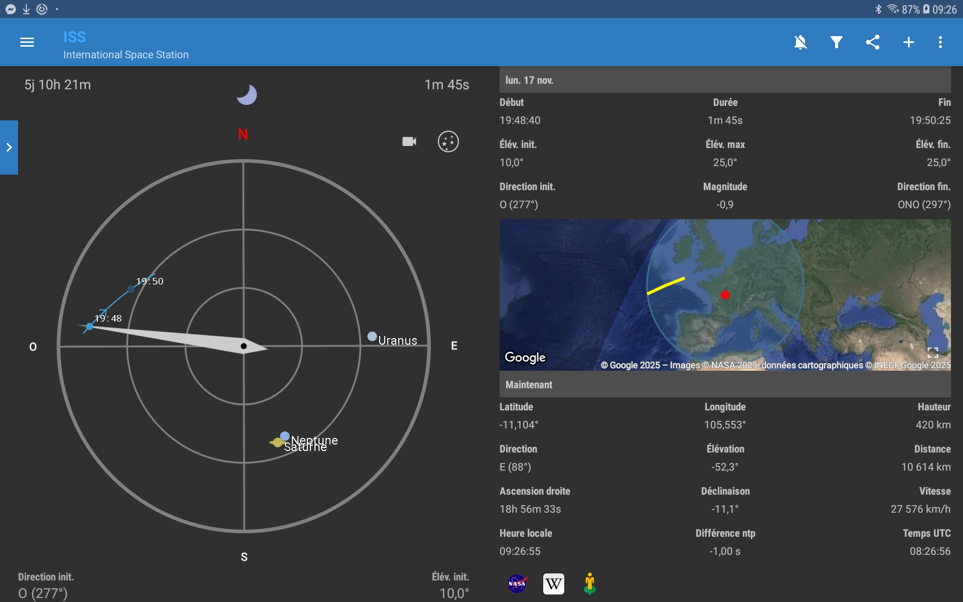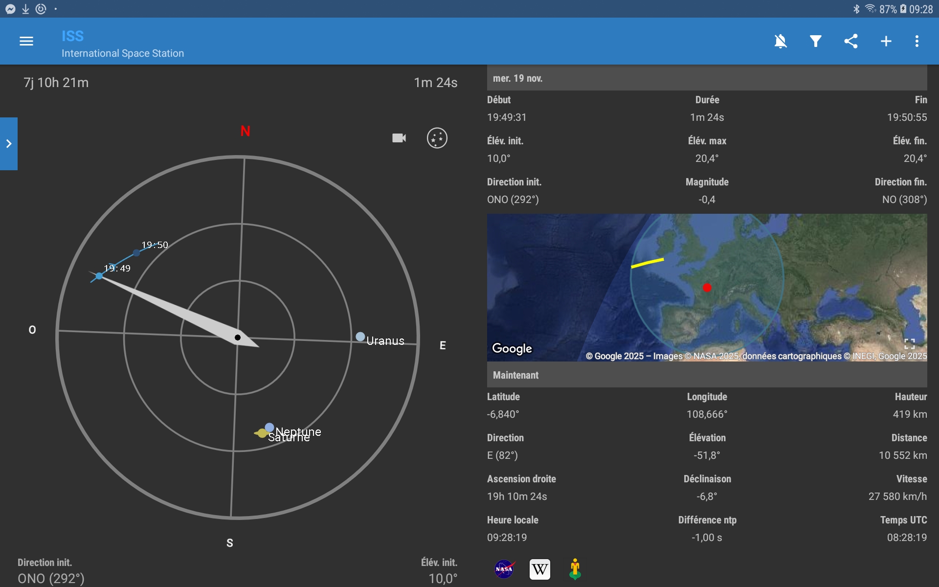 | ↓ Ces images sur https://www.heavens-above.com/ ↓ | ↓ Captures d'écran/ ISS détector pour Androïd. Prev/10 jours↓ |