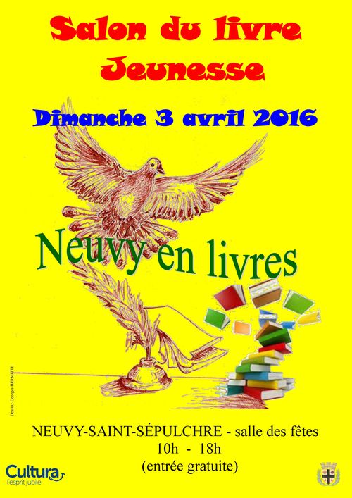 Dimanche 3 avril, un évènement majeur se déroulera à Neuvy Saint Sépulchre : le premier salon du livre jeunesse intitulé : "Neuvy en Livres". La commune m'a chargé de son organisation. Vous aurez le plaisir de rencontrer Georges Lemoine, illustrateur réputé, entouré de Adeline Paulian Pavageau, Marie-Andrée Verger, Marie Rollin, François Coulaud, Christian Bidaux, Camille Bellet... Les éditeurs : Violette et Lulu, Stylo en Piste, Azurite, Eponyme, Château de St Chartier, Le Père Castor... La librairie Sur les chemins du livre et ..... Rendez-vous le 3 avril 2016, à la salle des fêtes. Patrick LEMAGUERESSE |