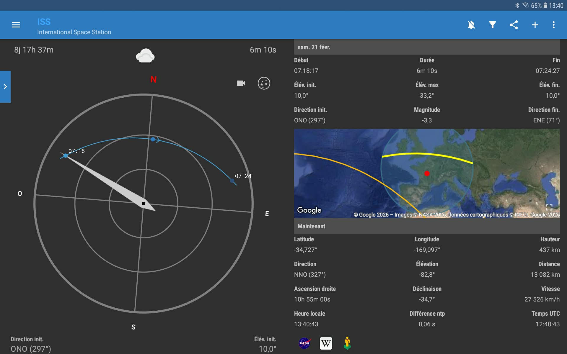 | ↓ Ces images sur https://www.heavens-above.com/ ↓ | ↓ Captures d'écran/ ISS détector pour Androïd. Prev/10 jours↓ |