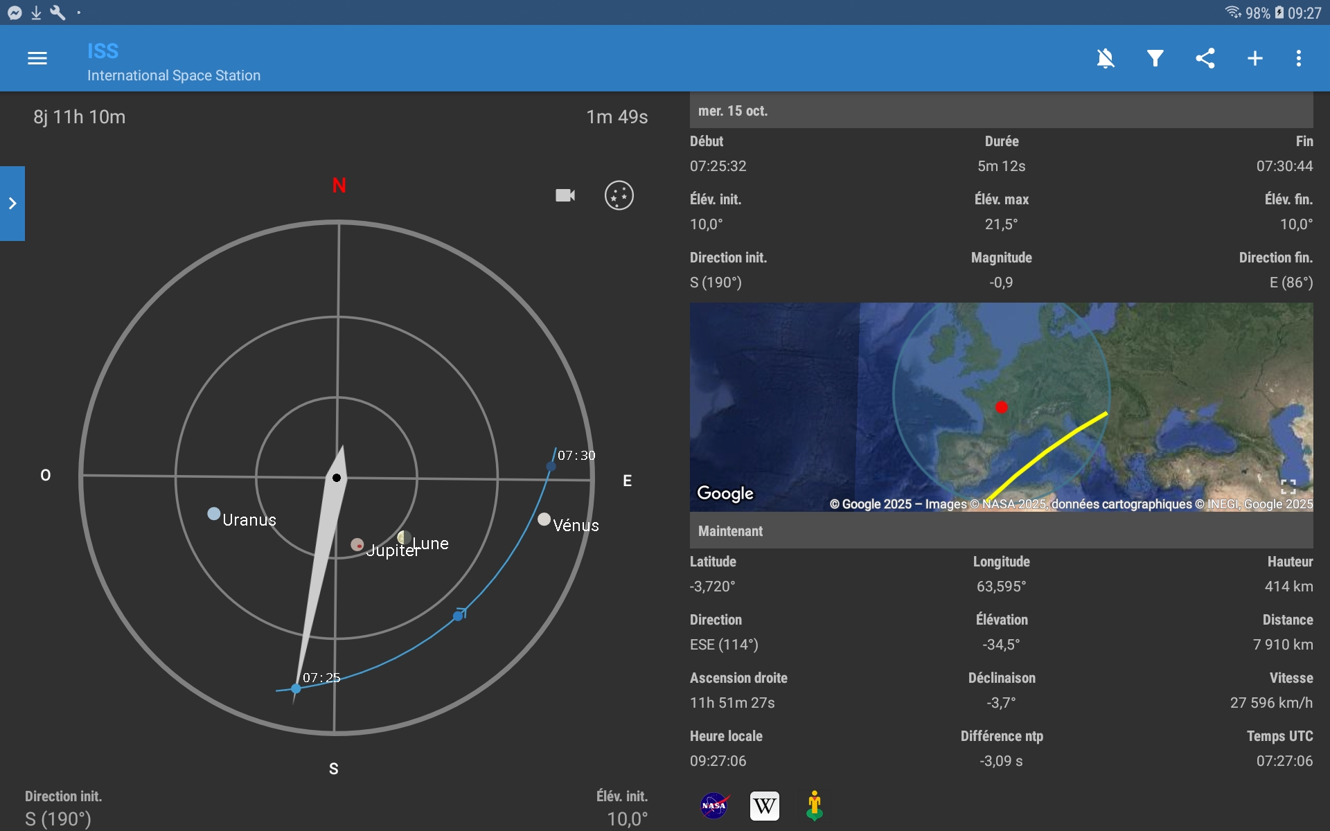 ↓ Ces images sur https://www.heavens-above.com/ ↓ | ↓ Captures d'écran/ ISS détector pour Androïd. Prev/10 jours↓ |